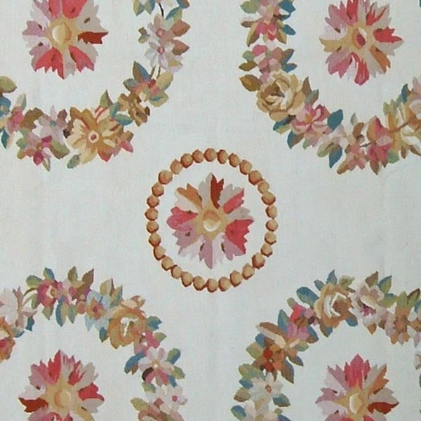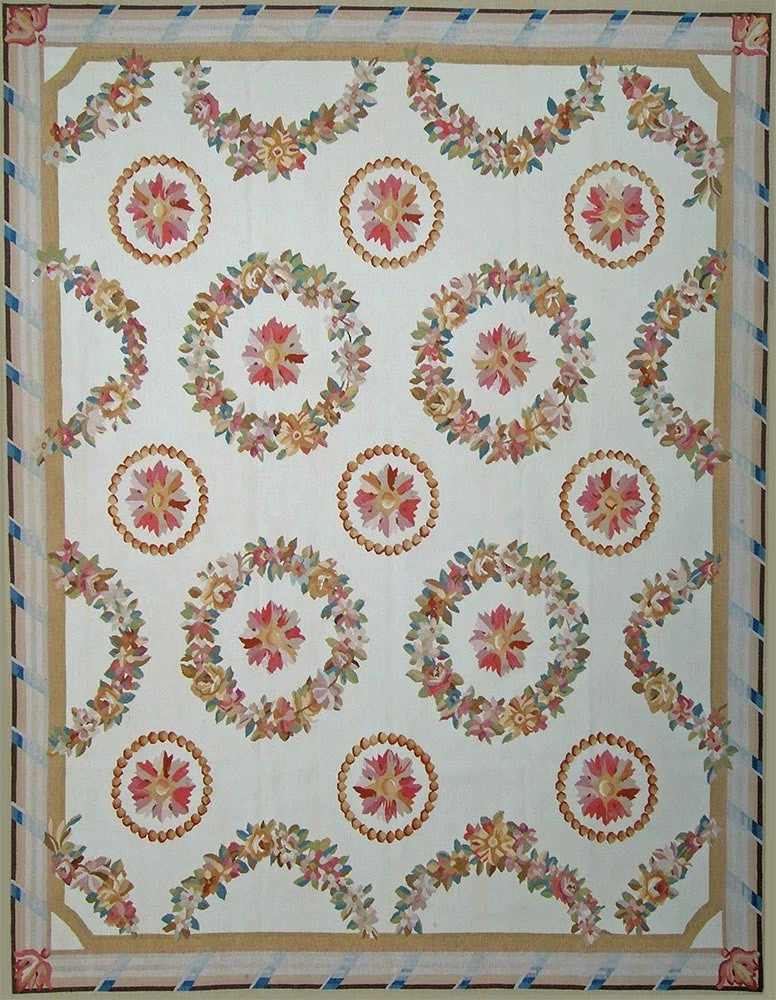 - Arles is inspired by neoclassical Aubusson carpets of the French Empire and Directoire periods. On a cream ground, large circular floral wreaths in rose, lilac, blue, gold, teal and sage enclose acanthus leaf rosettes in red, gold and lilac. Small gold beaded circles enclosing acanthus leaf rosettes sit in between the wreaths. A border of beige, cream and dark brown stripes with diagonal blue ribbon bands with red oak leaves at the corners completes this elegant rug.