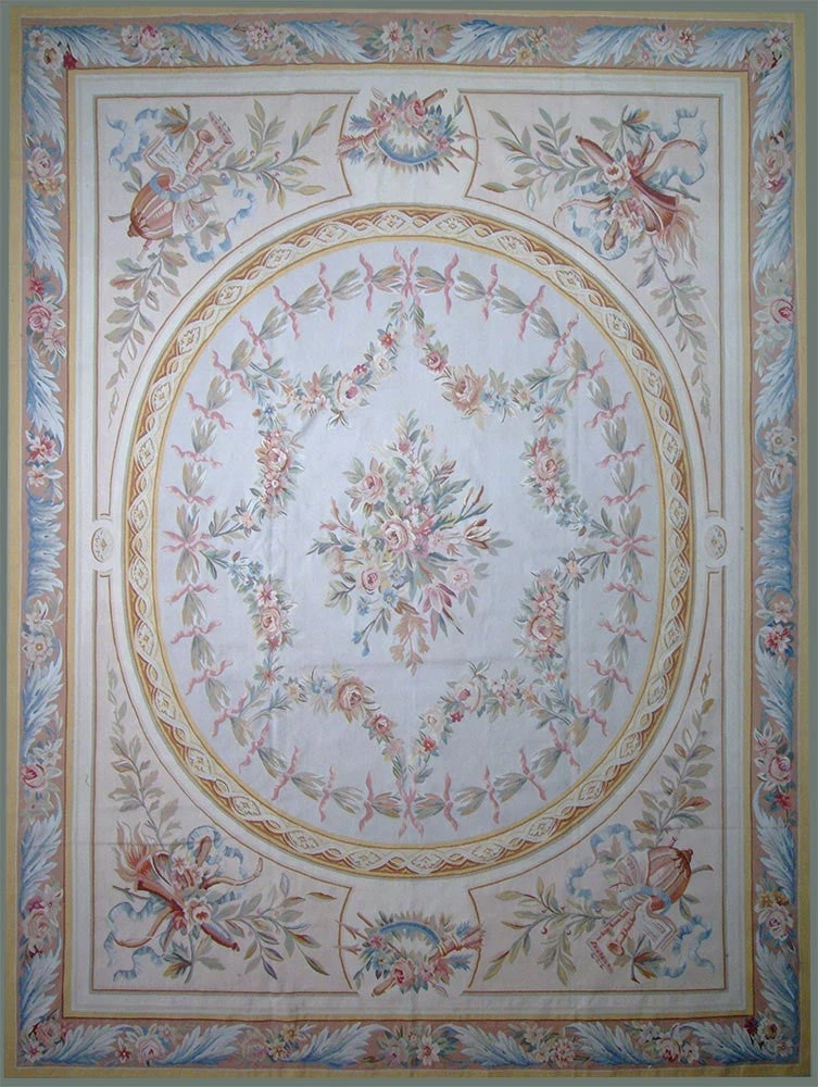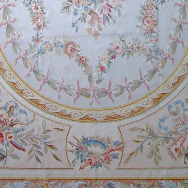 - Avignon is inspired by neoclassical Aubusson carpets of the French Empire and Directoire periods. A pale yellow-beige field is separated into four sections with each containing either classical Roman musical instruments or hunting gear. A large cream oval medallion contains a central floral spray of rose, lilac, blue, teal-green and beige surrounded by Della Robbia wreaths arranged to form a star. A reddish brown border with blue acanthus leaves and flowers and gold and brown outside bands complete this grand rug.