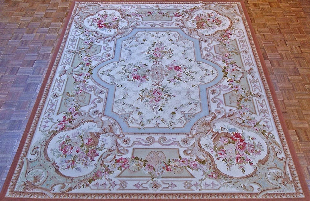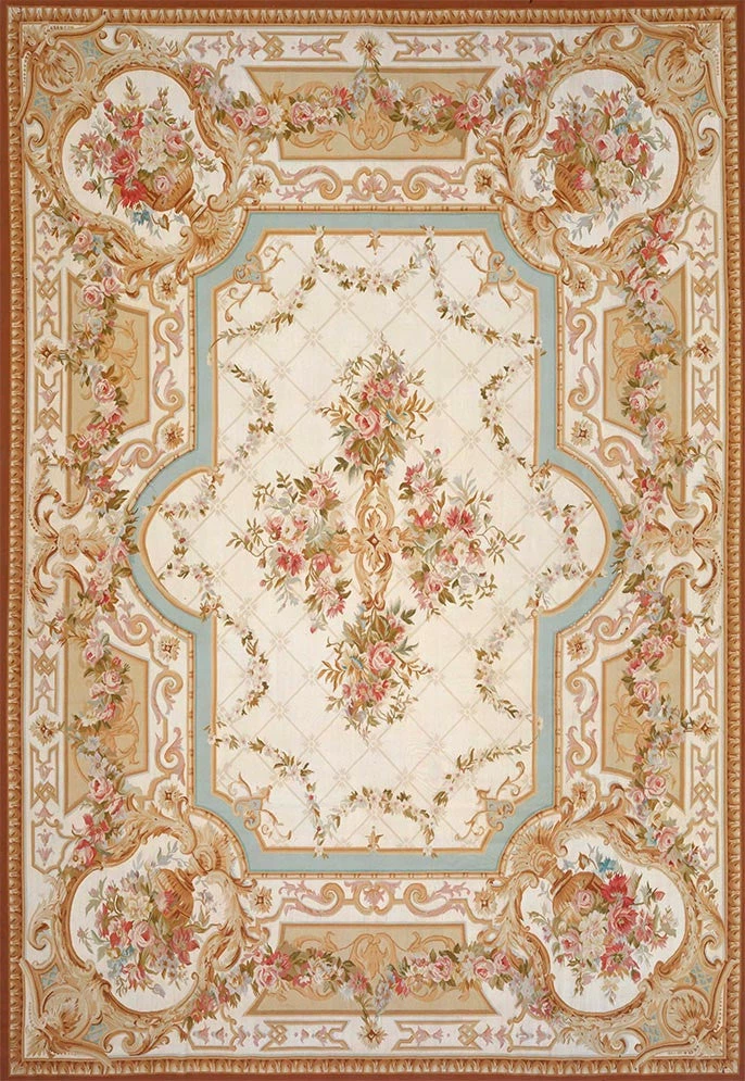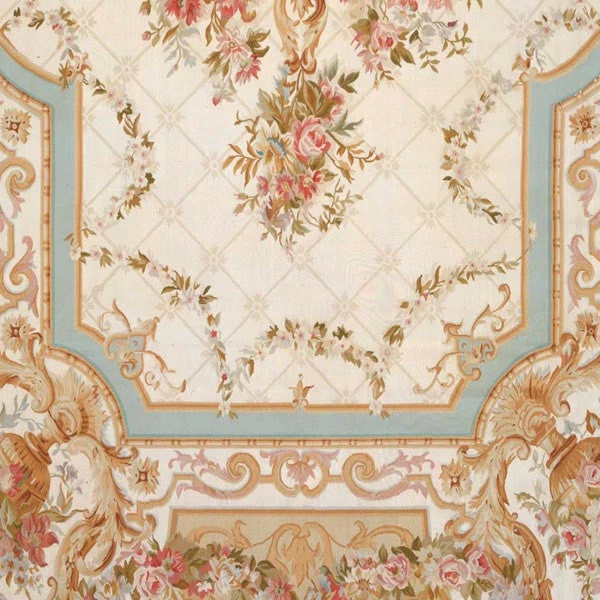 - Bourges is inspired by 19th-century French Aubusson carpets. A cream field with a beige trellis is edged with floral wreaths in cream, pale lilac and yellow green and contains a central medallion composed of four bouquets arranged around a gold and beige medallion of acanthus leaves. A blue inner border band with rounded corners and rounded midpoints provides a pop of color. The wide main border contains pale green panels with Della Robbia floral wreaths in rose, cream, blue, red, lilac and yellow-green. Cream cartouches in four corners contain large beige and gold urns containing overflowing floral arrangements.