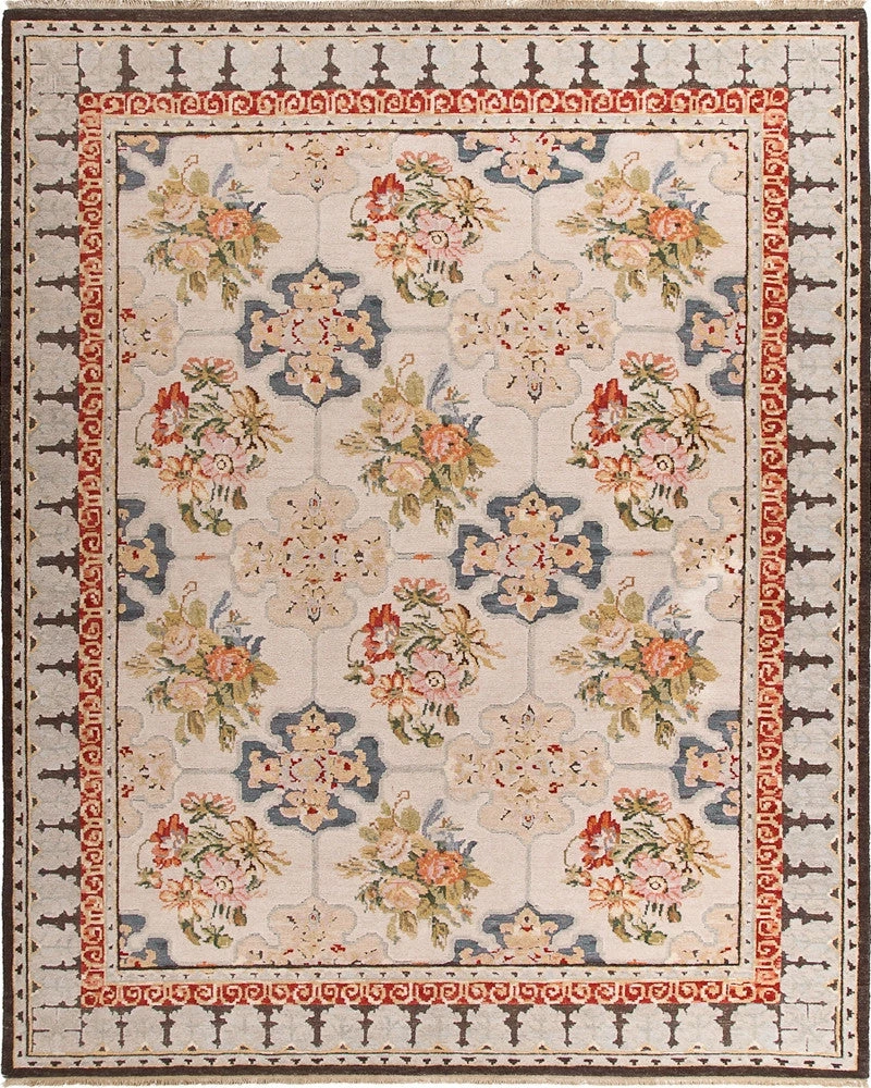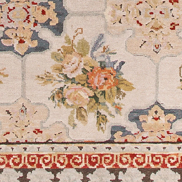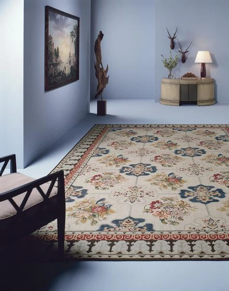 - Based on an original Asmara painting, Canterbury features rose, cream and green floral bouquets that alternate with wedgewood blue geometrical motifs on a cream background with blue and grey shading. It is a softer, more comfortable version of the traditional English tile designs that inspired the Bessarabian rugs commonly used in 19th Century Russian aristocratic homes.Â
