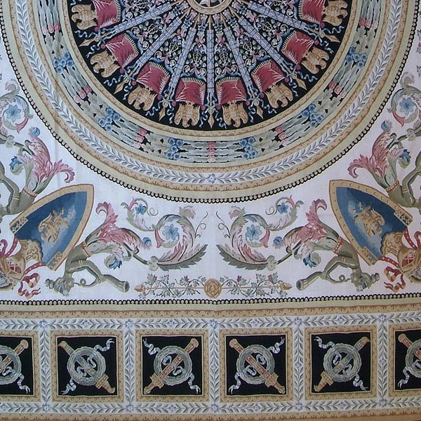 - Etienne is inspired by neoclassical Aubusson carpets of the French Empire period particularly the rugs designed for Napoleon by Percier and Fontaine. Each corner of the cream field has a blue shield and a knight’s helmet supported by a pair of mythical maidens sprouting acanthus leaves and blowing trumpets. A large round medallion with a navy blue inner circle has radial spokes of blue spears alternating with a gold eagle atop a red banner. The width side of the rug has a border of multiple navy blue squares each containing a laurel wreath crossed by either a quiver of arrows or a sword scabbard. The rug creates a regal atmosphere.