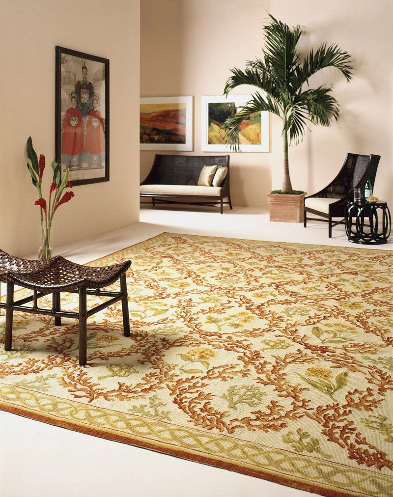 - Based on an original Asmara painting, winding coral trellises enclose sage green plants with yellow flowers. The nubby VenaturaTM needlepoint weave heightens the interplay of light, color and texture.