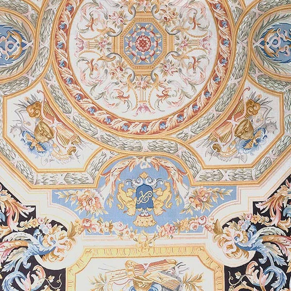 - Laffitte is inspired by Neoclassical French Empire Savonnerie carpets. A cream field is divided by acanthus leaf bands into four cream cartouches and two blue panels. The four cartouches contain classical Roman motifs and the two blue panels contain a royal shield held by a pair of gold lions with a gold crown above. A circular central medallion encloses an octagonal blue and gold medallion and four lyres. Four dark brown corners contain scrolls of acanthus leaves in rose, blue, gold and beige. Two cream panels containing classical Roman motifs sit between the corners on the width side. A border in blue, navy, rose and gold with an egg and leaf motif provides an architectural frame to this majestic rug.