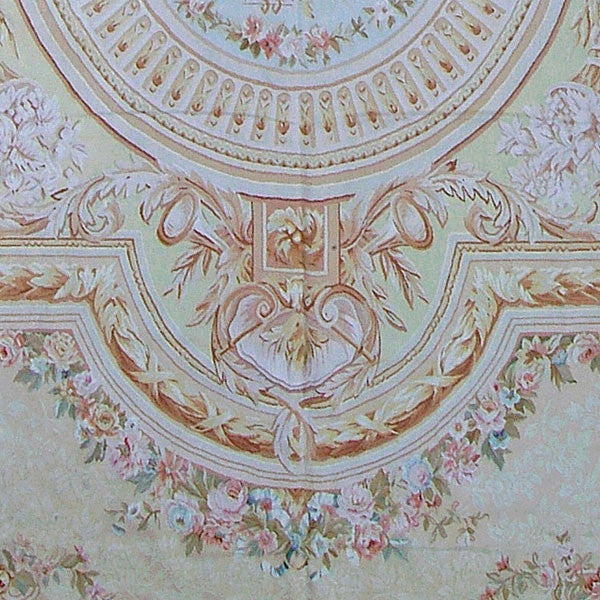 - Minerve is inspired by neoclassical Aubusson carpets of the French Empire and Directoire periods. A pale golden-beige field is surrounded by a laurel leaf frame that combines two sides of a rectangle with two half-circles. Inside are cornucopias and classic Roman hunting gear arranged around a large elongated oval medallion which itself contains two blue circular medallions with classical Roman hunting gear. A pale golden-beige border with a tone on tone damask floral is overlaid with Della Robbia floral wreaths in rose, lilac, blue, yellow, tan, teal, sage-green and teal. Four corners containing blue cartouches with floral arrangements and an outside border band of circular acanthus rosettes completes this magnificent and grand rug.