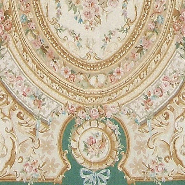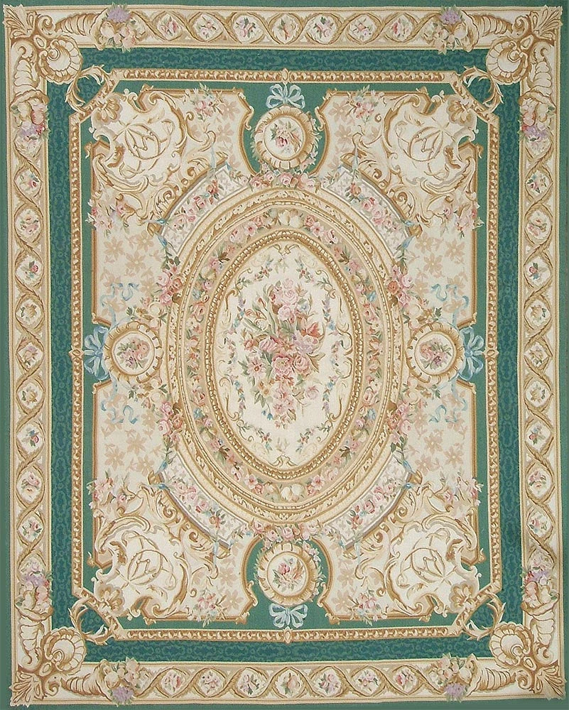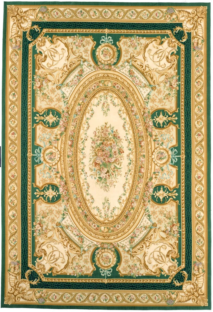 - Fontainbleu is inspired by a 19th century French Aubusson carpet. An emerald green damask outer field encloses a cream damask inner field which has six green cartouches that are connected to the outer green field. A cream oval medallion is balanced by four cream corner cartouches and a cream outer border containing gold cornucopias in each corner. Rose, teal blue, aqua and pink flowers soften the architectural frame of the rug.