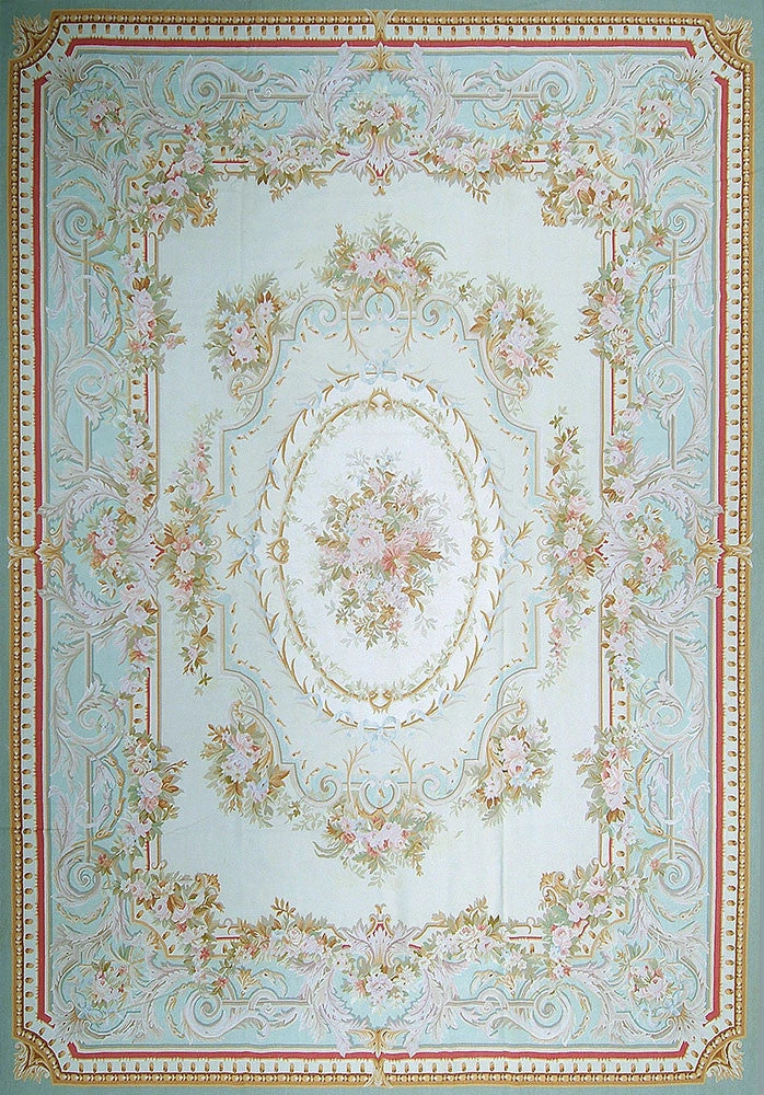 - Loire is inspired by a 19th century French Aubusson carpet. A pale sea-blue-green field contains an oval central medallion and is surrounded by a sea green border and multiple bands in pale sea-blue, red, gold and sea-green. Aqua, rose, gray, and yellow-green flowers adorn the entire rug.