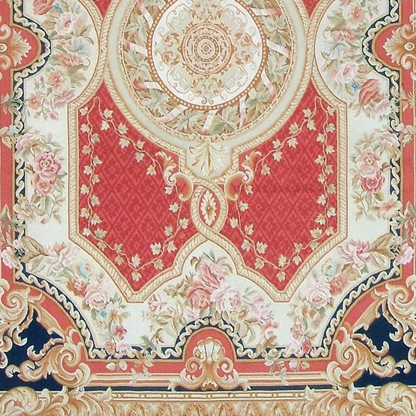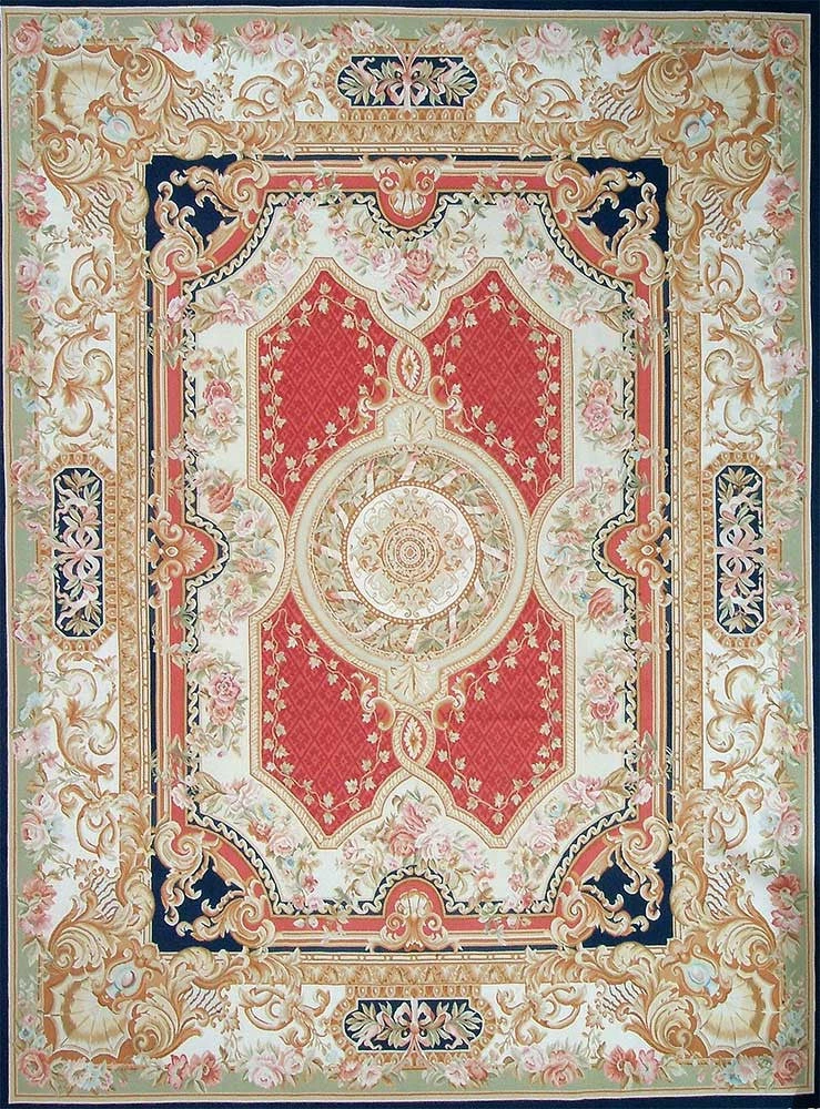 - Normandie is inspired by 19th century French Aubusson rugs. An ornate cream and green border encloses an “inner rug” with black corners, red band, cream border and red field with tone on tone geometric design enclosing a round pale green and cream medallion. Rose, lilac and blue flowers, gold acanthus scrolls, seashell motifs and grapevines adorn the surface of this glamorous rug.