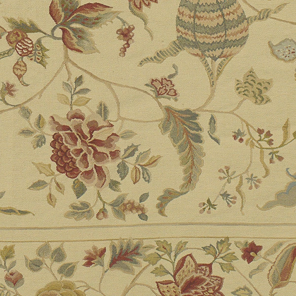 - Red, green, aqua, teal and gold motifs on a dark cream background in a design based on an original painting by Elizabeth Moisan inspired by18th century, hand woven, Indian chintz bed covers and wall hangings made for the English market. Such Elizabethan embroidery patterns, when executed by Indian artisans, metamorphosed into an exotic style and became highly fashionable in 18th and 19th century Europe.