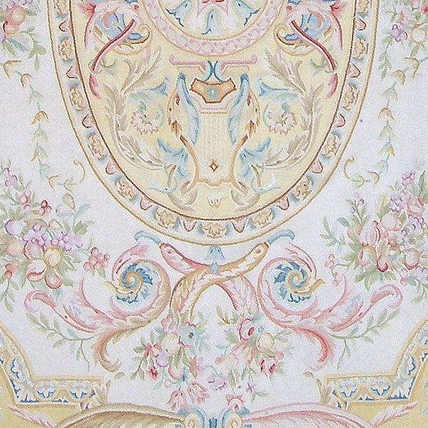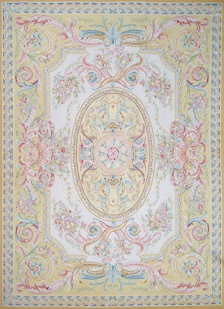 - Richelieu is inspired by a 19th century French Aubusson rug. It has a cream inner field, gold border and a gold oval medallion containing a pair of lyres and a circular medallion. Two blue and gold bands provide an architectural frame that complements floral, seashell and acanthus leaf motifs in blue, aqua, pink, rose, gold, lilac, beige, brown and green.