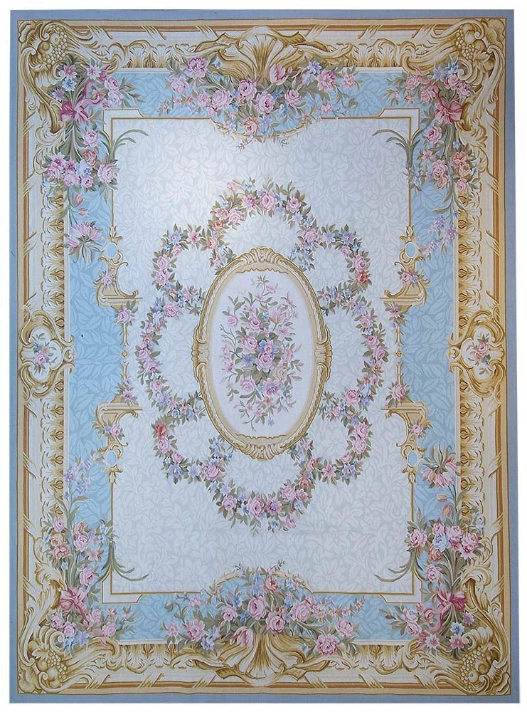 - Vienne is inspired by a 19th century French Aubusson rug. A pale grayish blue field covered with tone on tone leaves and flowers is enclosed within an inner border of blue tone on tone leaves surrounded by a gold border containing ornate decorations of acanthus leaves and shell motifs enclosed within an outer blue band. Wreathes and sprays with pink, blue and lilac flowers surround the oval central medallion and adorn the blue inner border.